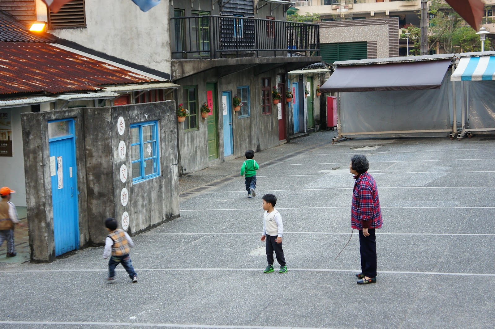 上面這張照片堪稱經典中的經典!我居然有幸目睹一群小屁孩在眷村廣場跑來跑去,重點是旁邊還有生氣的大審拿著細細長長的竹條要打他們!這該不會是台北市政府聘請的臨時演員吧!